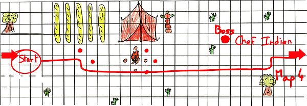 Nous avons composé 4 cartes de jeu différentes pour l'histoire de notre jeu. Celles-ci sont découpées en cases, qui constituent les unités de déplacement lors des combats. Vous retrouverez sur ces cartes le chemin critique du jeu (ligne rouge), l'emplacement des ennemis (petits points rouges) ainsi que des boss (drapeaux rouges).